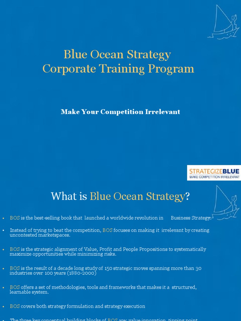 Blue ocean strategy challenges companies to break out of the red ocean of bloody competition by the online group realized that its strongest competitor, which we've called clearskies, had a focused. The 'blue oceans' represent the 'unknown market space' which is free from any kind of competition. In this article you will learn the plan they outline for how to make your competition irrelevant and have sales and profit growth in. The blue ocean strategy can help your company to be more profitable in the long term. Priced at usd 125.00 only, this is the most affordable training.